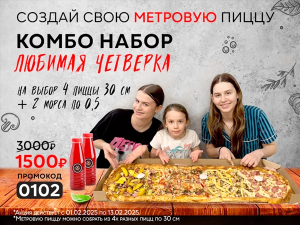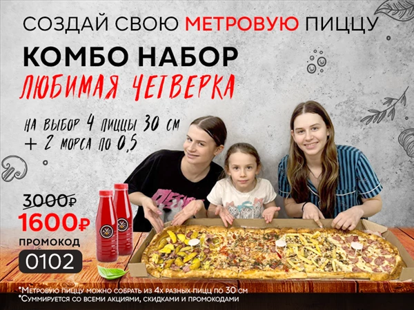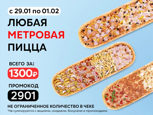 Промокод "2901" любая МЕТРОВАЯ пицца за 1300 руб!